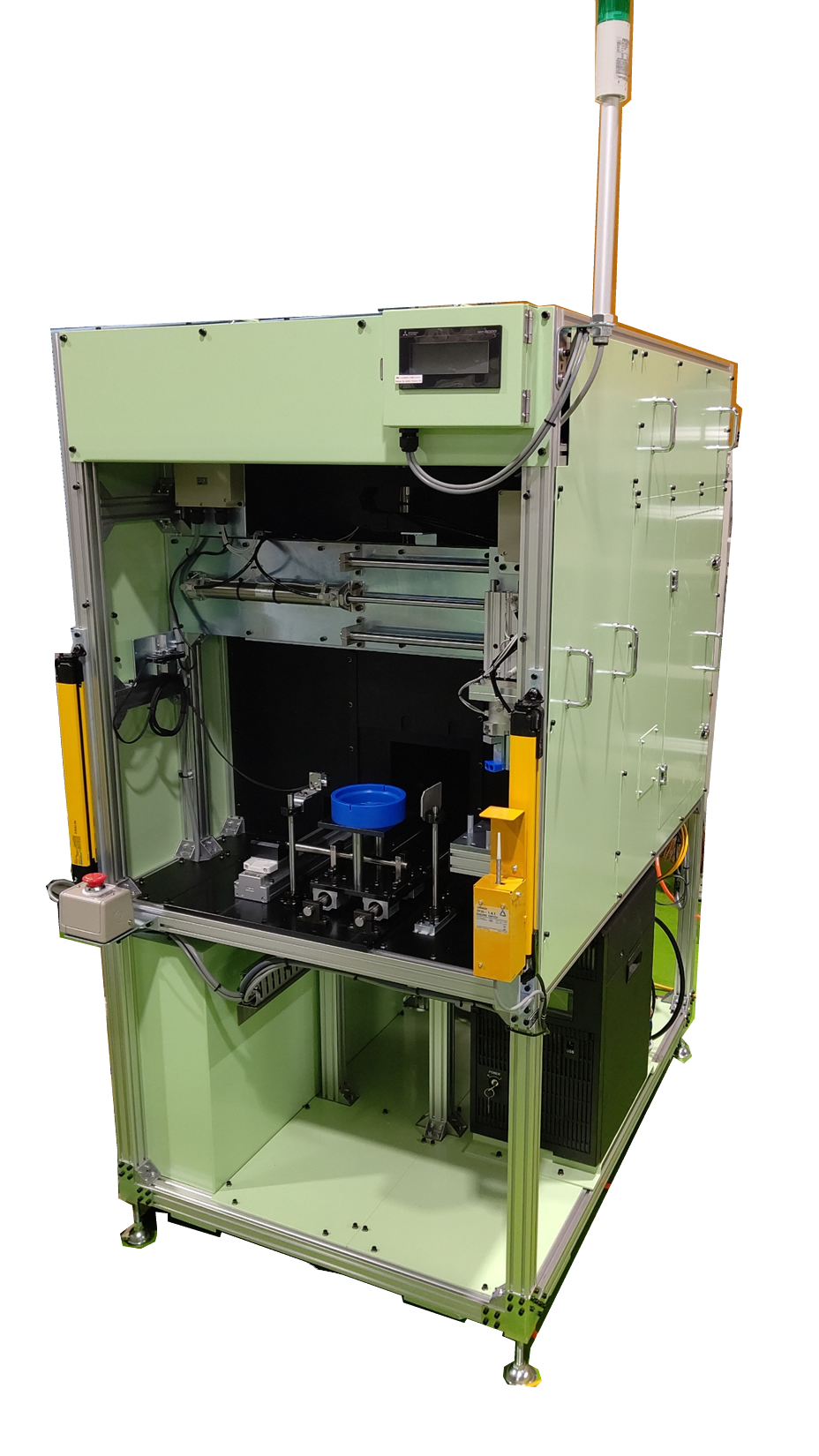 ホーム 一覧 レーザー刻印装置 レーザー刻印装置 処理工程 step1 作業者がワークセット step2 ながら起動SWで起動 step3 ワークを引き込み、扉が閉まる step4 自動で刻印開始 step5 扉が開き、ワーク排出で完了 特長 省スペースで設備間にも設置可能 治具を交換する事で多品種のワークに対応 脱着、操作も簡単で生産性向上 脱着を自動で行うことも可能 レーザーマーカーのメーカーはお客様指定メーカーで製作可能(既存流用も可能)