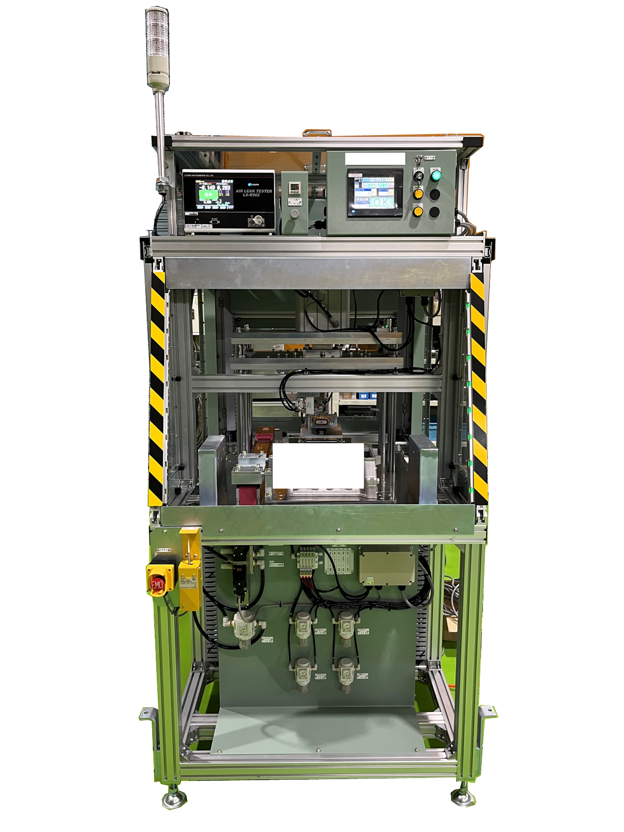 ホーム 一覧 リーク試験装置 リーク試験装置 処理工程 step1 作業者がワークセット step2 ながら起動SWで起動 step3 ワーク引き込み step4 クランプ、メクラ蓋が起動 step5 測定/判定(OKの場合は排出、NGの場合はその場停止等も出来ます。) 特長 ワークセットするだけでメクラ蓋、クランプ等は自動で起動 脱着、操作も簡単で生産性向上 脱着を自動で行うことも可能
